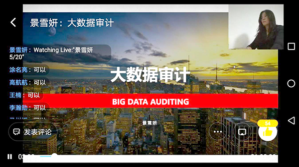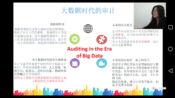 5月20日,会计学院邀请审计研究生导师、会计学院财务大数据分析中心主任景雪妍博士通过在线直播的方式作“大数据审计”报告会,师生100余人聆听报告。
