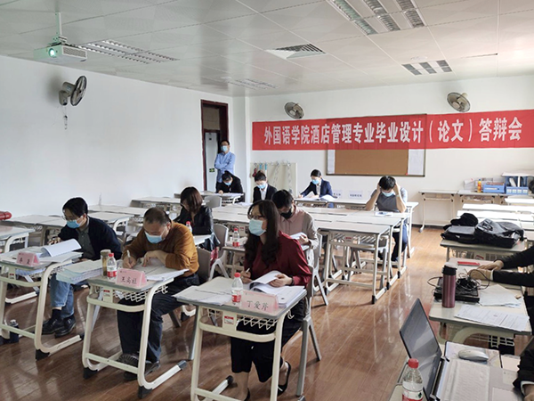 5月14日、15日下午,外国语学院酒店管理专业在3323教室举行了2016级本科毕业设计答辩。本次参加答辩的学生共有37人,其中36人进行现场答辩,在隔离期的1名湖北籍学生进行线上视频答辩。答辩现场还特意准备了等候室,师生全程佩戴口罩,间隔而坐。为了顺利开展本次答辩工作,院系提前要求答辩委员会成员及答辩学生提高认识,积极了解预防和防控知识,做好自我防护,坚持答辩质量的同时注重疫情防控。
