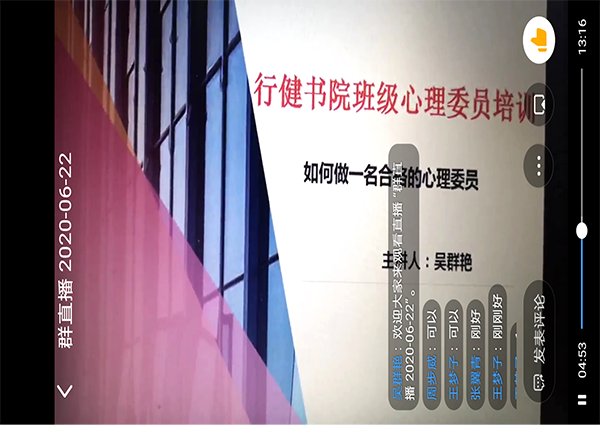 ——举行心理委员培训会。为了加强心理委员的工作职责,增强工作责任心。6月22日晚19:30分,行健书院举行线上心理委员培训会。培训会由二级心理辅导站咨询老师吴群艳主讲,主题为《如何做一名合格的班级心理委员》。通过班级心理委员的重要性、工作职责、心理委员应具备的素质及案例实践方法介绍等四个方面的介绍,同学们进一步明晰了自身的工作内容和职责,掌握了日常工作基本方法,促进班级心理健康工作更上新台阶。