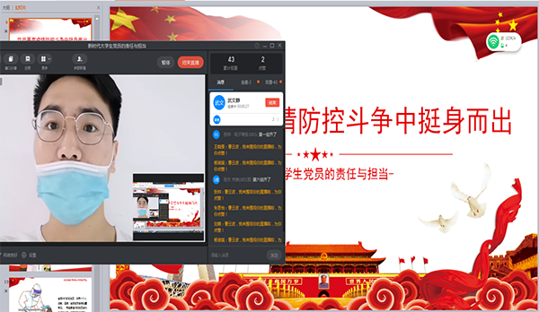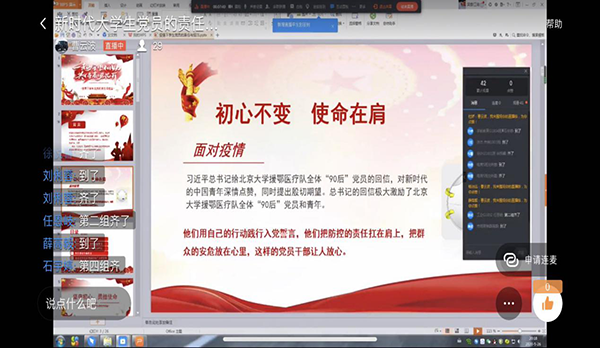 首先,支部书记曹云波传达了习近平总书记给北京大学援鄂医疗队全体“90”后党员的重要回信精神,指明了此次在疫情大考中,无数青年党员勇于担当、冲锋在前,涌现出一个个温暖感人的故事,用实际行动践行初心使命,向党和人民交出了合格答卷。随后,曹老师指出,一个支部一个堡垒,一名党员一面党旗。再三强调疫情就是命令,防控就是责任。广大学生党员要不忘初心、牢记使命,不断增强战胜疫情的政治自觉、思想自觉和行动自觉,把投身防控疫情第一线作为践行初心使命、体现责任担当的试金石和磨刀石,挺身而出、英勇奋斗、扎实工作。最后,曹云波老师指出,作为当代大学生,新时代的青年,参与这一场防控疫情的人民战争,是一笔宝贵的人生经历。学生党员们也应在这一场战役中展现出作为共产党员的勇敢、坚强、责任与担当。当祖国有难,我们全国各族人民会众志成城,团结一致!学生党员石宇婷表示,作为当代的大学生的我们更要肩负责任,担当使命。大学生作为社会的一份子,理应扛起自己的责任,在国家需要的时候,一定会挺身而出,争做志愿者服务人民,献出自己的青春力量。