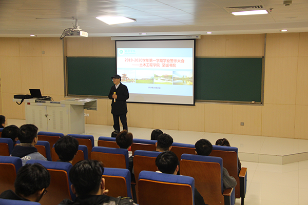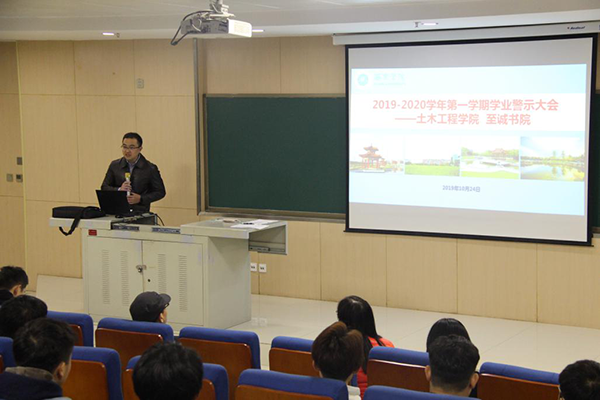 为进一步宣传学业警示制度,使学生了解并遵守这项制度,24日下午,土木工程学院联合至诚书院在图书馆103报告厅举行2019-2020学年第一学期学业警示教育大会。土木工程学院院长傅少君、副院长谢明、院长助理权娟娟,至诚书院发展科科长惠媛、至诚书院辅导员和受学业警示的所有学生共67人参加本次大会。会议由副院长谢明主持。