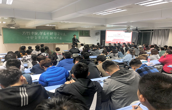 为建设一支胸怀理想、心系同学、品学兼优、作风扎实的工作骨干队伍,共同维护组织形象,更好履行工作职责。11月11日晚,万钧书院全体学生干部在2308教室召开学生干部学习学生干部自律公约、培训大会,院学生会指导老师代贝出席本次会议。