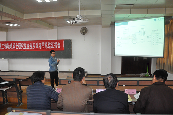 会上,12名硕士研究生分别对自己在5个月实践中学到的知识,获得的成果,遇到的问题、如何解决问题,自己的不足之处及最终的感悟进行总结。通过汇报了解到,全体研究生在实习期间不仅能严格按照实习要求开展实习工作,并能参与企业项目、撰写论文、申请专利、参加竞赛等且成果显著。同时,大部分学生从企业实践的众多项目中找到自己学位论文的研究方向,拟定了论文题目。