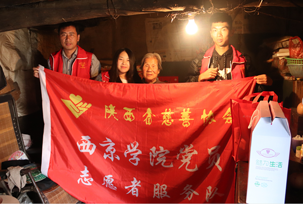 志愿者一早从西京学院出发,驱车100公里将省慈善协会筹集的爱心物资送到农村困难老党员、抗美援朝老兵、孤寡困难老人手里。