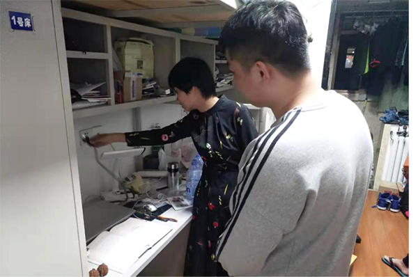 本次检查主要包括宿舍安全用电以及安全隐患排查,经检查,未发现私拉电线及酒精灯、热得快等易燃易爆违章用品,但部分宿舍仍存在人走插座不断电的情况,插座放到床褥上充电,各辅导员在检查现场对有安全隐患的宿舍都进行了安全教育,纠正违规用电。对存在问题一一登记及时反馈给相关辅导员,进行再次教育,希望广大学生引以为戒,悉知宿舍安全用电规范。
