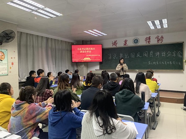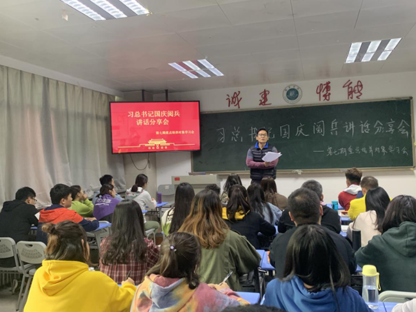首先,王龙分享了习近平总书记的讲话内容以及自己的学习感悟。他认为,习近平总书记的重要讲话深情回顾了中华人民共和国70年波澜壮阔的历史,鲜明回答了70年历史性变革中所蕴含的内在逻辑,明确指出了前进征程上奋斗的方向。他从党的根本宗旨出发,以“信仰”、“信念”、“信心”的重大价值为基础,告诫同学们,一定要毫不动摇的坚持党的领导,不忘初心,艰苦奋斗!