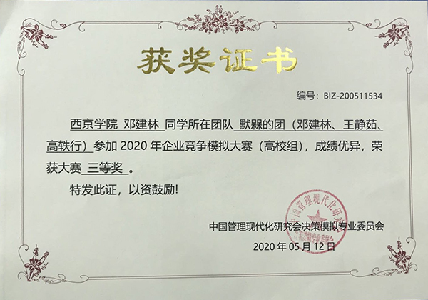 6月15日,商学院市场营销专业组织学生参加了2020年全国企业竞争模拟大赛,通过预赛、复赛、半决赛、线上总决赛的四轮模拟对抗比拼,学生团队最终取得了国家级三等奖的成绩。