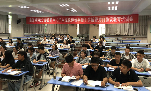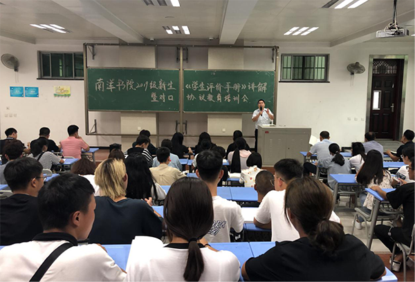为切实开展好对口协议教育,南洋书院于9月8日下午17:00在一号教学楼1108多媒体教室举行了“2019级新生《学生成长评价手册》讲解暨对口协议教育培训会”,书院院长王培涛、发展科科长范光、事务科科长何权红、大一年级全体辅导员、2019级各班班长、学习委员和团支书参会,会议由范光主持。