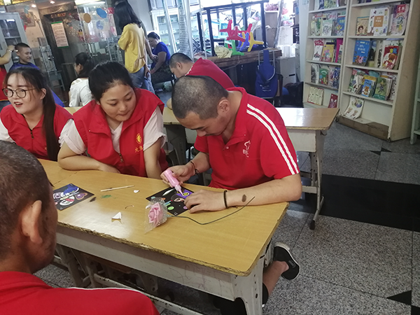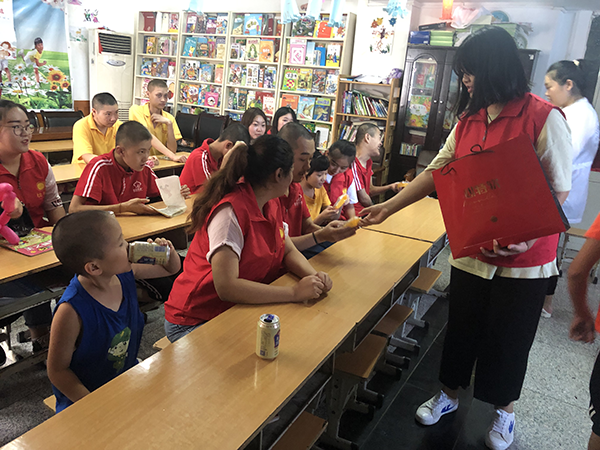 志愿者们为星星残障阳光花园先做好卫生清扫工作,然后陪着残障儿童做手工、画画、做游戏、写字、折纸,并且帮助老师为他们理发,组织他们有序地排队。最后志愿者们给孩子们分发了月饼和水果,提前祝他们中秋快乐并且进行了合照留念。