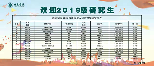 为做好2019级研究生的迎新报到和入学教育服务工作,以高效、热情、周到、优美的氛围,引导研究生新生尽快适应环境和角色转变,以最快最佳的状态投入到新阶段学习、科研和校园生活中,为后期学习科研打好坚实的基础,学校开展了各项研究生入学教育的活动。