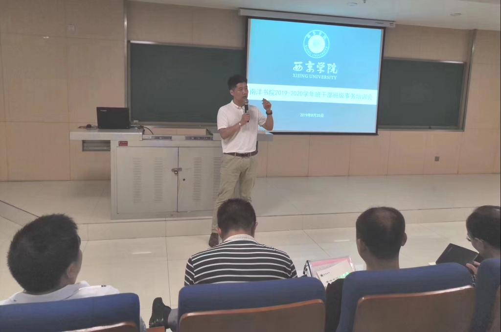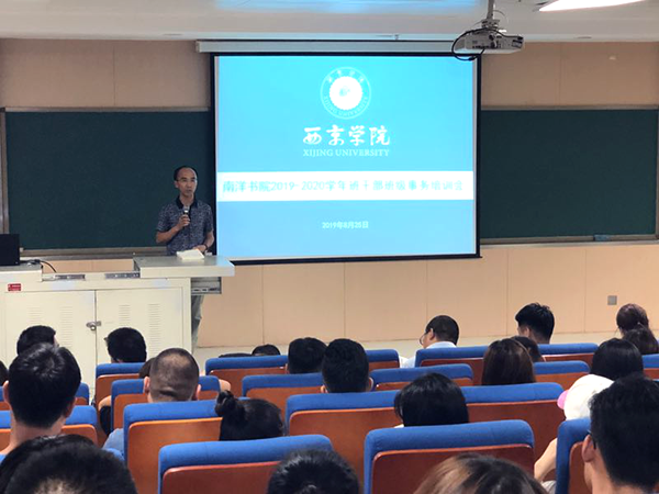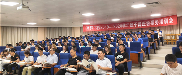为了提高学生干部的工作能力和水平,南洋书院于8月25日下午16:00在校图书馆103报告厅举行了“2019-2020学年班干部班级事务培训会”,书院院长王培涛、发展科科长范光、事务科科长何权红、大二大三年级全体辅导员、2017及2018级各班班长和团支书参会,会议由范光主持。