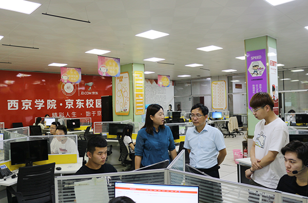 6月18日下午,管理技术系主任李俊、教务科长弋俊楠、电子商务教研室主任李云飞及实习指导教师李盼一行,来到西京学院·京东校园实训中心看望并慰问了正在实习的学生。