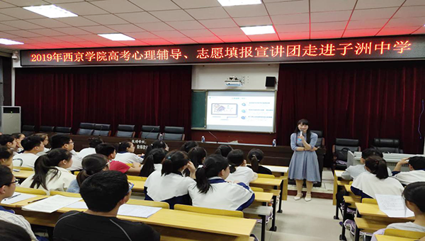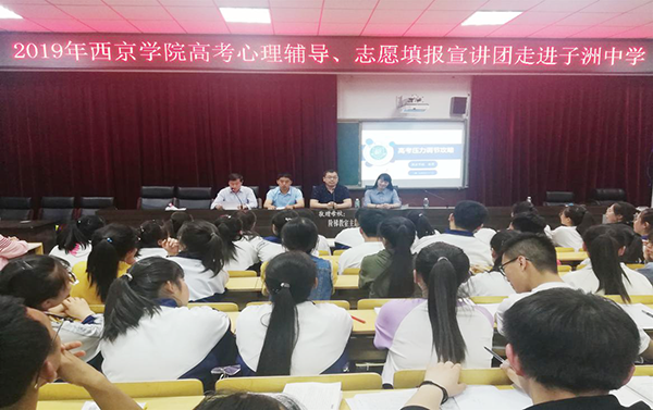 2019年是新中国成立70周年,也是子洲县脱贫摘帽之年,为了更好开展扶贫工作,践行习近平主席“扶贫先扶志”指导思想,5月22日晚,西京学院高考政策宣讲团走进子洲中学报告厅,对2019年高考政策进行宣讲。我校大学生心理健康教育与咨询中心张哲、创业学院事务科科长赵晓华分别就考前心理调适和填报志愿注意事项做了报告,子洲中学副校长曹鸿飞主持报告会,县教育局专干王康及子洲中学200余名高三师生听了报告。