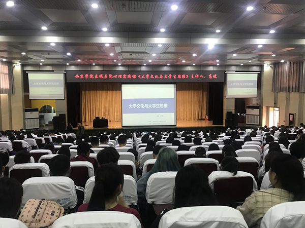 他讲到:大学文化是指一所大学的历史积淀,是由师生长期创造形成的产物, 包括传统习惯、 生活方式、 价值观念和思维方式等,并以西京文化为例,引导学生要热爱西京文化,传承西京精神。