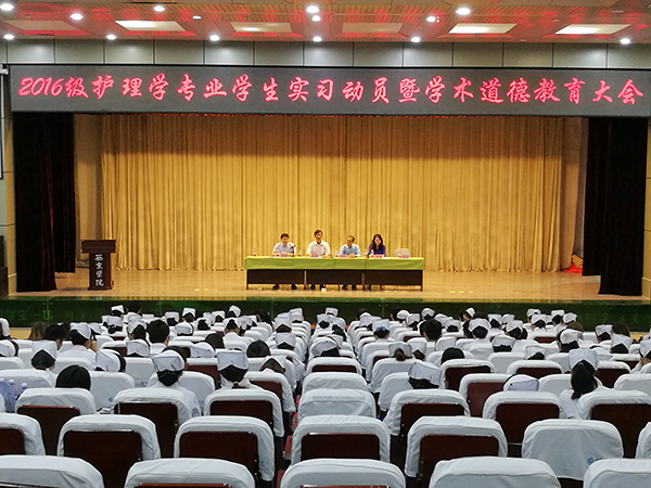 5月24日上午,医学院在小礼堂举办2016级护理学专业学生实习暨学术道德教育大会,教务处处长肖建军、教务科长韩朝、护理学专业带头人张胜,护理学2016级全体同学参加了本次会议,会议由张煜星主持。