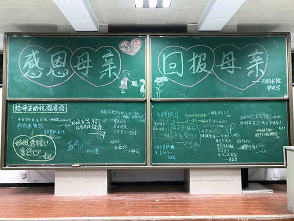 莫泊桑说:“人生最美的情景,出现在我们怀念母亲的时候。只是因为我们的血液中流淌的、我们的言行举止中流露的那份独特而超凡的东西,都来自母亲的辛勤哺育和言传身教。”万钧书院护理18级学生在黑板上写下对母亲的祝福寄语,通过细腻真挚的话语传达子女对母亲那份感恩与依恋。