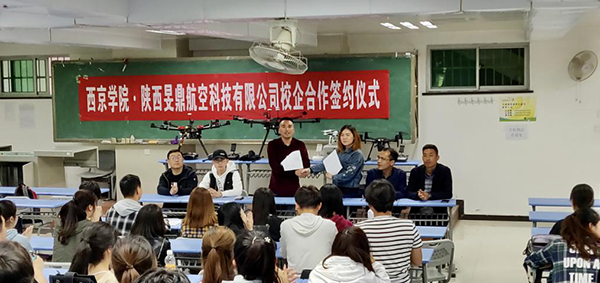 4月16日,传媒学院与陕西旻鼎航空科技有限公司举行了校企合作协议签署仪式。 陕西旻鼎航空科技有限公司创始人周小丰、总经理刘继,传媒学院院长张西静、教务科科长张欢生、网络与新媒体教研室主任李政和全体教师、网络与新媒体、新闻学2017级全体同学参加签约会。会议由网络与新媒体教研室主任李政主持。