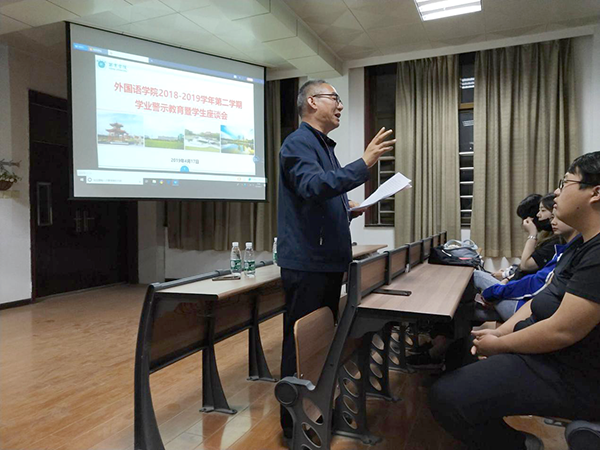 为全面加强学风建设,营造良好的学习氛围,提高学生的自主学习意识,做好对学习困难学生的教育、引导,帮助其顺利完成学业,4月17日晚,外国语学院联合博雅书院、创业书院、行健书院在三号教学楼3206教室召开“2018-2019学年第二学期学业警示教育机学生座谈会 ”。外国语学院院长、教务科全体老师、全体辅导员、受警示同学、各班班委、参加了此次会议,会议由外国语学院教务科科长耿瑞霞主持。