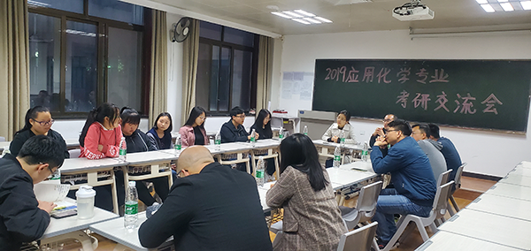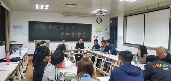 为加强我院学生对考研知识和经验的了解,营造积极向上的学风,为2016级正在备考的同学加油鼓劲。2019年4月10日晚7点,我院在3511教室举行“2019年应用化学专业考研交流会”。