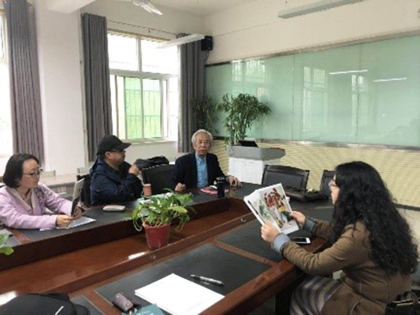 活动主要分为讲解、观摩、互动三个方面。丁聪伟教授介绍了水彩画在中国的发展历史,水彩工具材料的使用方法,并以作品为范例,为各位教师分析水彩作品中的形式和美感。丁聪伟教授提出在水彩教学过程中要特别注意:一要灵活处理课本内容,让被动变成主动;二要授课老师认真改作业,学生就认真做作业;三要实践出真知,让学生动起来;四要注重教学艺术;五要多补充课外知识,更新知识库。互动环节讨论结束后,丁教授还和于慧老师分享了自己作画过程以及特殊技法和经验。