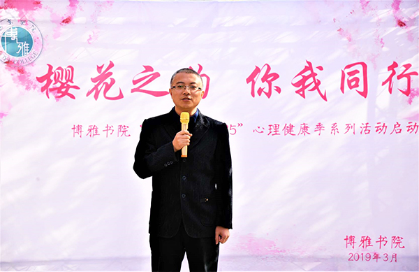 为深入贯彻陕西省教育工委有关心理健康季文件精神,根据校心理中心统一安排和部署,博雅书院于3月29日在我校樱花停车场举行了“樱花之约,你我同行”博雅书院心理健康季系列活动启动仪式。大学生发展与服务中心主任杨德森、外国语学院院长谢俊平、博雅书院院长马璐,全体辅导员、各班级心理委员和宿舍心理委员代表参加了启动仪式。