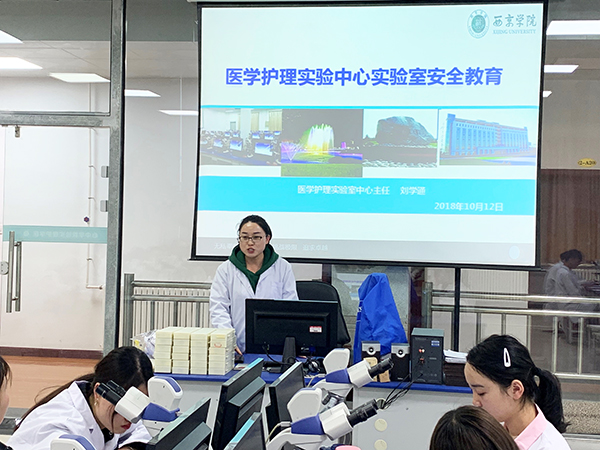 刘学通介绍了医学护理实验教学中心整体安全建设情况,就化学实验室和医学类实验室特点分别从学生行为规范、仪器操作、着装规范等几个方面对学生进行了培训,并要求学生干部在班会课上传达到每一位学生。在实验室发生紧急情况下,要求学生干部第一时间报告老师。