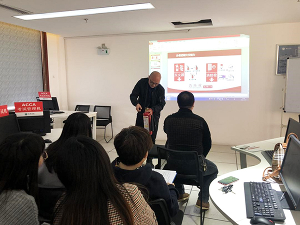 张龙磊老师首先为大家解读了教育部下发的《关于进一步加强高校教学实验室安全检查工作的通知》文件精神,提出应充分吸取经验教训,牢固树立“隐患就是事故”的观念,完善安全管理体制。同时结合三个学院的学科专业特点,提出文科实验室安全管理的重点集中在用电及防火两个方面,从消防器材的管理、初期火灾的处置、消防器材的使用三方面详细介绍了消防安全的基本知识与处置方法,并在讲解过程中进行了常用灭火器使用的操作示范。