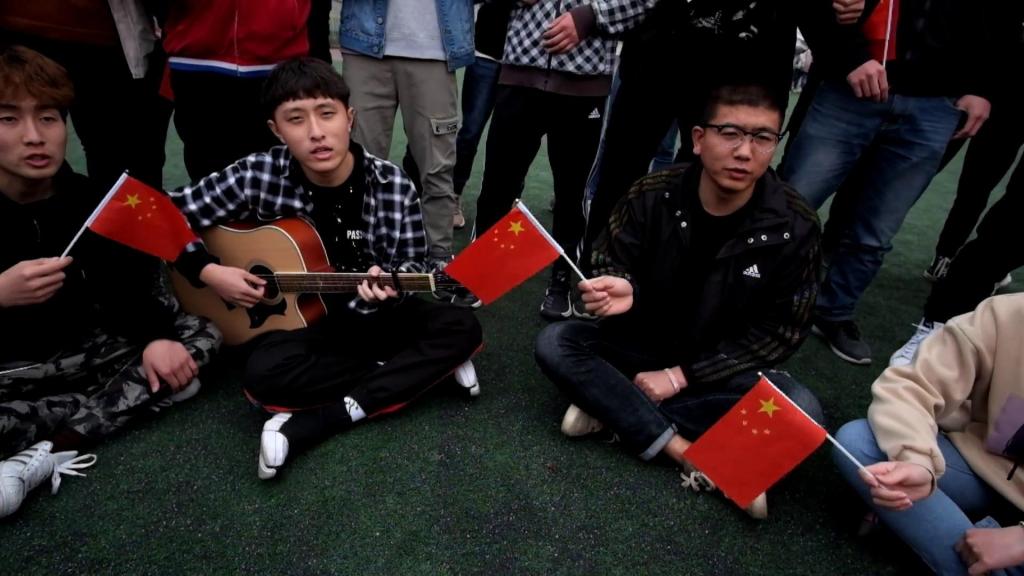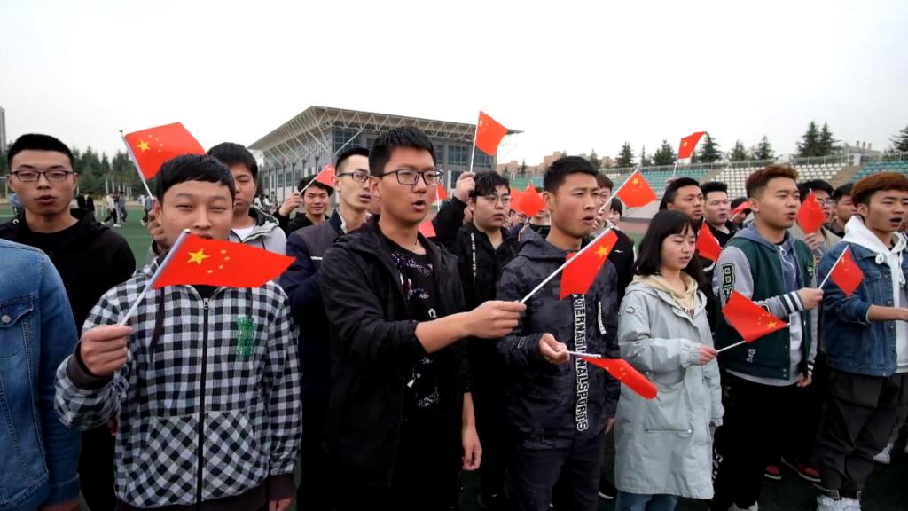 下午3:00,吉他伴奏《我和我的祖国》旋律响起,同学们从四周涌出走向操场中央,与领唱学生一起开始了大合唱。