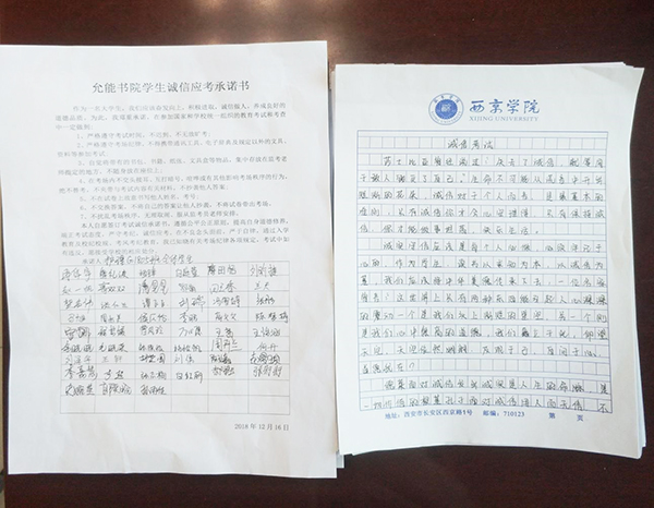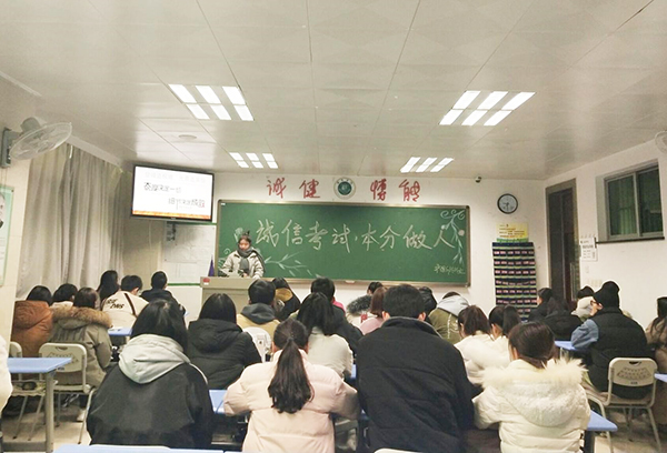 签订诚信考试承诺书。各班级充分利用宣传载体,加强“诚信考试光荣、违纪作弊可耻”的宣传教育,通过制作板报,通过班级QQ群、家长微信群等方式积极宣传学校考试政策和相关规定,家校联动共同教育学生诚信考试。目前,各班辅导员组织召开考前动员会,与学生签订《诚信考试承诺书》,学生书写诚信考试的心得体会和保证书,加强学生自律意识,自觉维护大学生形象,促使学生自觉遵守考试纪律,坚决抵制考试作弊。通过考前动员及诚信考试主题教育活动,同学们充分认识到了诚信考试、积极应考的重要性,纷纷表示用自己的实际行动来践行自己的诺言。