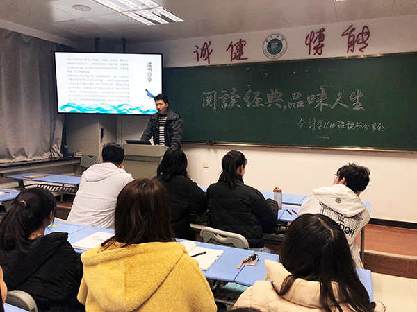 为了增强文化自信,弘扬中华民族优秀传统文化,阅读传承经典,引导学生养成“爱读书、爱分享,会读书、会分享”的良好习惯,激发广大学生的读书热情,提高其阅读能力,营造良好的读书氛围,推进班级的学风建设,至诚书院会计学1609-1612班、CPA1601班于近日组织开展了“与书香相伴,与智者同行”读书分享活动。本次活动以班级为单位,各班级围绕好书推荐、读书心得分享、经典赏析等内容展开了活动,同学们积极响应,踊跃参加。