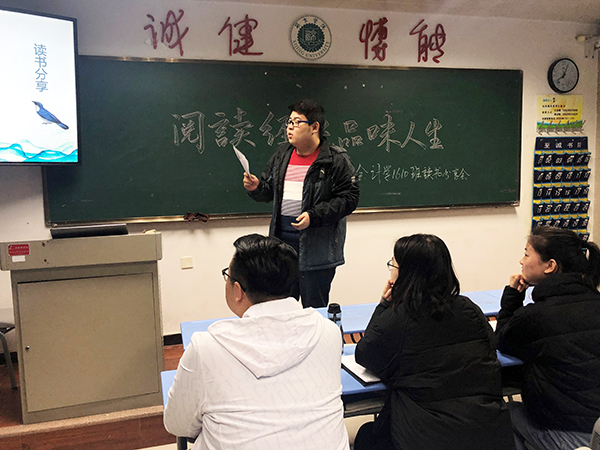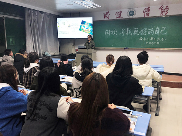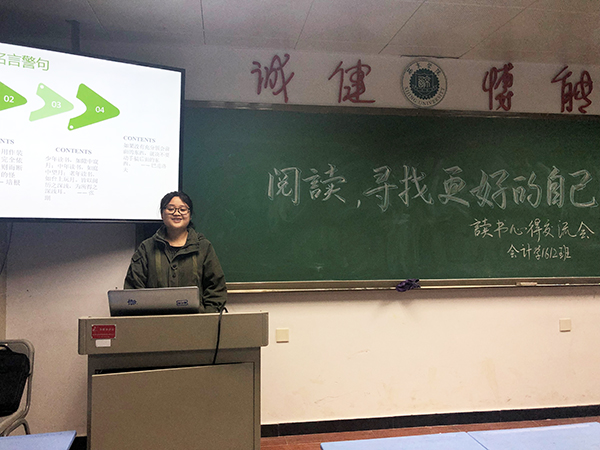 会计学1612班以“阅读,寻找更好的自己”为主题开展了读书心得交流。班长成晶首先发言,她引用了高尔基的名言“书籍是人类进步的阶梯”,告诉同学们书籍是人类宝贵的精神财富,是知识的源泉,是经验教训的结晶,是走向未来的基石,希望同学们通过阅读,可以寻找和做到更好的自己。她还为同学们推荐了《变革中国:市场经济的中国之路》和《至味在人间》两本书。随后刘龙同学也做了读书分享,他认为经常读书的人,在语言表达及文字写作方面与不爱读书的人都有显著差别,大学生应该多读书,增加文化底蕴。