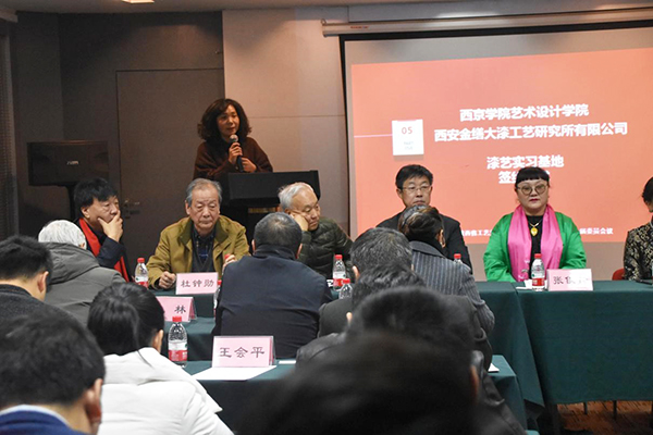 会议期间,我院艺术设计学院美术教研室主任郭红娟老师受邀参加,并代表设计艺术学院与西安金缮大漆工艺研究所有限公司签约校企合作协议,共建漆艺实习基地。