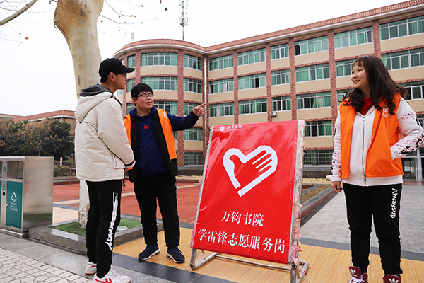 ——设立校园志愿服务岗。万钧书院青年志愿者协会在各教学楼下、餐厅前、教工家属楼前设立学雷锋青年志愿者服务站,为过往的学生、老师和教工家属提供力所能及的志愿服务。志愿服务站是本次雷锋月活动的重要组成部分,旨在充分发挥万钧书院青年志愿者的先进性、组织性,搭建志愿服务平台,实现志愿服务活动常态长效,提升志愿服务能力。
