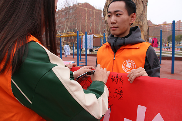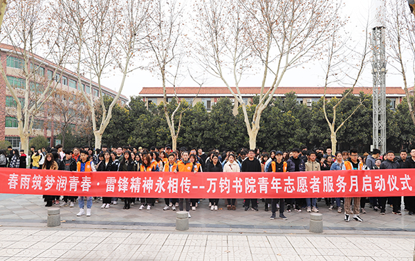 ——举办青年志愿者服务月活动启动仪式暨志愿服务签名活动。3月5日下午,万钧书院在距西安广场北侧举行志愿服务月启动仪式暨志愿服务签名活动,启动仪式由分团委书记夏筠主持,全院300余名志愿者参加。活动中,志愿者宣读了万钧书院青年志愿者服务月活动倡议书,全体志愿者纷纷表达了向雷锋学习、积极投身志愿服务活动的决心,并在活动条幅上签下了自己的名字。