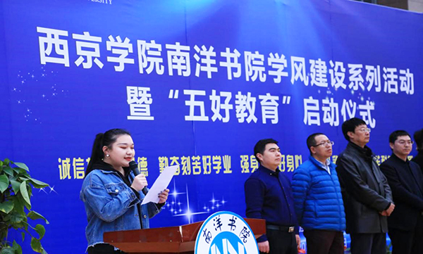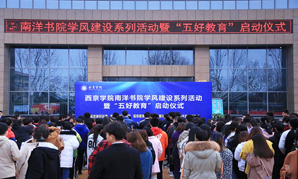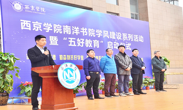 3月5日,南洋书院在我校大学生发展与服务中心门前举办“学风建设系列活动暨‘五好教育’启动仪式”。教务二处处长边伟、大学生学业指导中心主任张京鹏、南洋书院院长王培涛、商贸技术系与学前教育系主任葛伟、应用会计系主任李杰及学生代表500余人参加了本次活动。