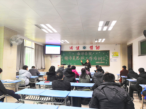 12月24日下午,南洋书院组织开了辅导员思政工作专题培训会,校思政部副教授王俊受邀为与会人员作题为“新时代高校思想政治工作的新要求”主题报告。书院院长庞舒月、发展科科长范光、事务科科长丁照勇、科室学工干部及全体辅导员老师参加了会议。