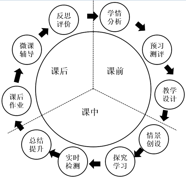 提升教学质量。其课程核心特征包括4个方面:教学决策数据化、评价反馈即时化、交流互动立体化、资源推送智能化。教师通过“学情统计、资源发布、教学设计、课题导入、新任务下达、精讲与点评、个性化推送、批改作业”8个步骤开展教学,学生通过“预习与作业、课前讨论、展现分享、合作探究、随堂测试、巩固提升、完成作业、总结反思”8个步骤开展学习。通过“8+8模式”的课程教学流程结构,基于“课前、课中、课后”的闭环实现教学持续改进。