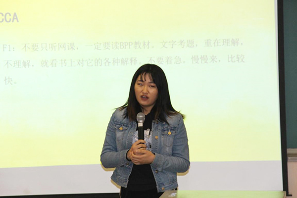 学习经验分享会上,ACCA1501班优秀学生代表黄梦丹分享了其通过ACCAF1-F9全部9门课程,并参加了P阶段的考试;多次参加全国大学生英语竞赛,均获三等奖以上奖项。她为大家详细介绍了ACCA每一门课程的学习重点与方法。她说学习是一个不断提高自我的过程,我们要适当给自己压力,但不要太在乎结果,不要自暴自弃,要静下心来分析自己失败的原因,争取以后不犯同样的错误。努力不一定有好的结果,但不努力一定是一无所获。她还分享了通过努力获取立信会计师事务所上海总部offer的经历,在讲述中多次表达了进入ACCA班给自己带来的改变。