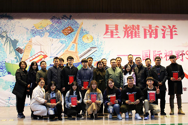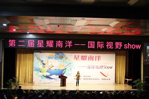 11月6日晚, 第二届“星耀南洋―国际视野SHOW”活动在校小礼堂举行。国际交流中心主任任长江,国际交流中心老师王俨功、管理技术系老师王宏伟、南洋书院发展科科长范光、事务科科长丁照勇担任本次大赛的评委。南洋书院院长庞舒月出席了此次比赛,南洋书院600余名学生代表观摩了本次比赛。