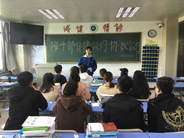 “班干部自律公约”协议签订。各个班委各司其职却又相互联系,除了做好本职工作就是服务集体,一定要杜绝官僚主义、以权谋私、把个人情绪投入到班集体建设中,要同学之间相互沟通交流,交换彼此的学习、生活心得和经验,才能更好地开展工作。要做接地气又能自我约束的班干部,才能建设优秀班集体。