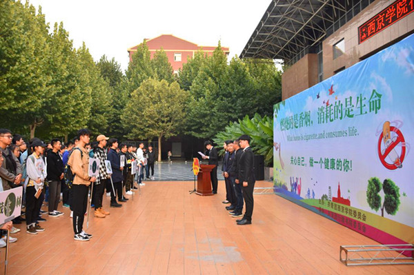 举行“禁烟”活动启动仪式。10月11日,由校团委主办、行健书院分团委承办的“无烟世界 清新校园”为主题的禁烟活动启动仪式在学生中心门口举办,校团委书记马杨利、行健书院分团委书记王轲、团学组织学生干部及各班学生代表500余人参加,仪式由西京学院研究生会副主席田怀谷主持。学生干部代表臧英琦向全体同学发出倡议,号召全体同学远离烟草,营造文明无烟校园,养成良好的生活和学习习惯,遵守校纪班规,做优秀大学生。马杨利向广大青年学生提出要求,全体师生要从自身做起,相互监督,共同营造一个文明、和谐、有序的无烟校园。随后,师生纷纷许下庄严承诺,在签名活动中,学校领导、老师和同学们都积极参与其中,争做校园“禁烟先锋”。