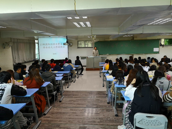 10月25日,商学院在2301教室举行了国际经济与贸易专业毕业论文宣讲会。该专业2015级全体学生及参与毕业论文指导的教师参加了此次宣讲会,此次宣讲会由国际经济与贸易专业负责人任冬玲老师主持。