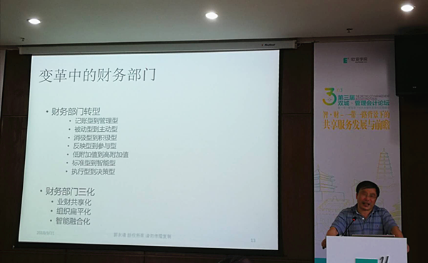 本次论坛共邀请了七位客座嘉宾做报告。其中上海国家会计学院郭永清教授以“新技术驱动财务管理变革”作为专题,认为在变化的时代下,企业追求的目标是不变的——企业为价值而生。提出财务不可能在真空中存在,它必须和运营结合起来,企业财务人员也要主动求变。中兴新云服务有限公司财务总监孙彦从以“转型求变,共享未来”为专题,也提出企业应注重业财融合。认为财务变革的目标是建立面向未来的企业财务管理。伴随着财务变革而生的是财务的工业革命、财务的信息化改造以及财务的数字化转型。