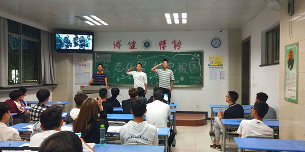 退伍新生出现在讲台上一声“敬礼”“礼毕”响彻整个教室,展现出军人的风貌,使在坐的每一位同学热血沸腾。电子商务G1803班张子威和电子商务G1804班的张耿首先为同学讲述部队生活不但可以磨练自己的意志、品质,部队所培养的优良作风,还让自己一生受用,最后热情的回答了同学们提出来的问题。让同学们进一步了解人民军队是支作风优良,听党指挥,能打胜仗的队伍。接下来辅导员魏秉权老师为同学们解读了今年征兵的条件和相关政策,鼓励有意愿的同学积极报名参军,勇于担当,在实现中国梦、强军梦中彰显人生价值。