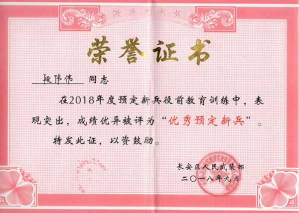 在9月我校数十名毕业生和在校生积极应征入伍,保家卫国。通过体检、政审合格后,允能书院护理G1702班学生段伟伟参加了长安区人民武装部2018年度预定新兵役前教育训练。整个训练中段伟伟正确认识,严格要求自己,服从命令、听从指挥,严格完成训练任务,提前从思想上、行动上入伍。经过几天的刻苦训练,段伟伟被长安区人民武装部评为“优秀预定新兵”,并被中国人民解放军海军陆战队和空军空降兵部队同时选中,最终如愿加入中国人民解放军空降兵部队,于9月12日踏上保家卫国之旅。