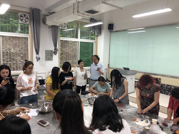 王老师带着师生一起和面、揉面,揉好的面会放在热水盆上蒸一下,发好的面里会有气孔,散发出很浓的发酵味道。然后用擀面杖擀成一个圆饼型,在擀好的面上摆一排的枣子,捏出一个叶子的造型,再用篦子在上面按出叶子的纹路,再用有颜色的豆子在馍上摆出一定的形状,做好记号。制作期间臧院长以及各位老师,辅导着学生体验花馍手工技艺,并给同学们讲述着传统手工技艺中的文化传承价值,以及在今后的专业学习中如继承传统、开发与创新。