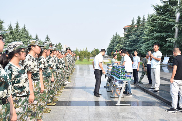 训练场上,同学们列队整齐、军姿挺拔、口号嘹亮。在教官的严格训练下,短短几日,同学们的齐步走、正步走及分列式等预定训练科目已初见成效。在短暂的休息期间,曾皈栋带领全体常任导师为训练场上刻苦训练的教官和学生们分发雪碧,缓解闷热、送去清凉,感谢教官对同学们的耐心训练和悉心指导,激励同学们训出风格,训出水平。同学们举起雪碧,齐声喊“老师,辛苦了!谢谢老师”。曾皈栋肯定了教官和学生不怕吃苦坚持训练的精神和优秀表现,对2018级书院军训学生所表现出的高昂斗志给予了高度评价。同时强调天气炎热,一定要注意防晒、多喝开水、注意身体状况,照顾好自己。同时,他希望同学们在军训的过程中磨砺自己,收获成长,能把这种精神带到学习中去,做一名德智体美劳全面发展的卓越人才。