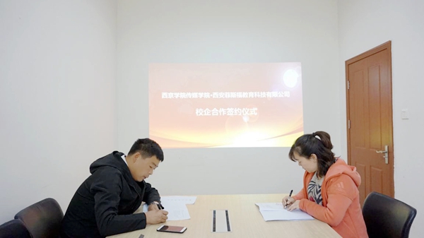 3月21日传媒学院与西安菲斯福教育科技有限公司签订了校企合作协议,传媒学院院长张西静,西安菲斯福教育科技有限公司经理肖建锋及数字媒体应用技术教研室主任张鹏军参加了签订仪式。企业将为数字媒体应用技术专业提供专业实习实训教学,每年接纳50到100名学生参与实习实训课程,并能提供一定的就业机会。