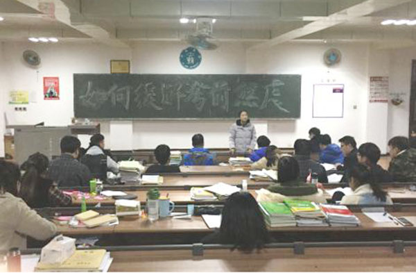 ——考研学生考前心理疏导。随着全国研究生考试时间的临近,为帮助考研学生稳定情绪,提高效率,行健书院二级心理辅导站安排四名咨询老师为学生做了“如何缓解考前焦虑”报告会,主要围绕怎样树立良好心态、如何调试自己的情绪、科学规划复习时间等方面进行阐述。会后同学表示此次活动开展的很及时,为他们压抑、焦躁的心情带来了慰藉,活动达到了预期的效果。