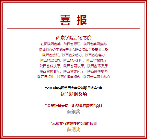 西京网讯:西京学院万钧书院在“2017年陕西省青少年公益项目大赛”中获1银1铜奖项。“关爱折翼天使,汇聚孤独梦想”项目获银奖“无线交互式逃生防盗窗”项目获铜奖。